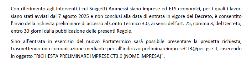 Se sei un’impresa o un ente del terzo settore economico e hai avviato lavori tra il 7 agosto e il 25 dicembre senza ultimarli, devi inviare la richiesta preliminare per non perdere l’accesso agli incentivi del Conto Termico 3.0 Scadenza urgente: La comunicazione deve essere inviata entro il 18 gennaio (termine prudenziale rispetto ai 30 giorni previsti). Come inviare la richiesta: In attesa del nuovo portale, la documentazione va trasmessa via PEC all’indirizzo [email protected]. Oggetto PEC: Richiesta preliminare imprese CT3.0 [Inserire Nome Impresa].