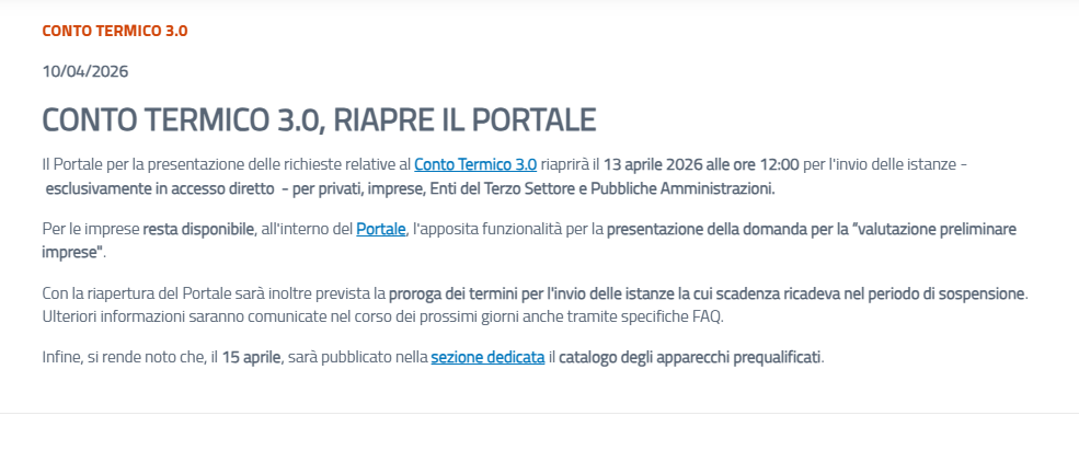 📅 Il Portale per la presentazione delle richieste relative al Conto Termico 3.0 riaprirà il 𝟭𝟯 𝗮𝗽𝗿𝗶𝗹𝗲 𝟮𝟬𝟮𝟲 𝗮𝗹𝗹𝗲 𝗼𝗿𝗲 𝟭𝟮:𝟬𝟬 per l’invio delle istanze – esclusivamente in accesso diretto – per privati, imprese, Enti del Terzo Settore e Pubbliche Amministrazioni.
