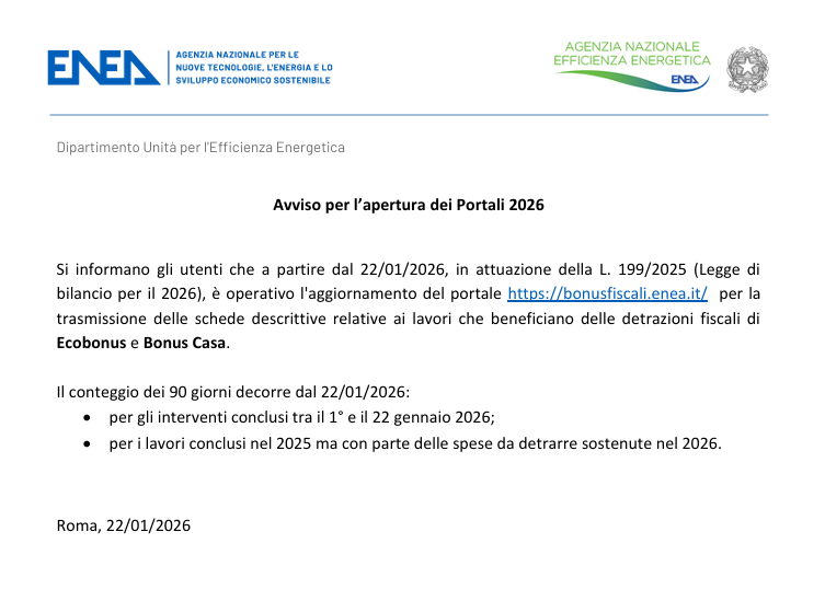 ENEA 2026 – Aperti i portali per le comunicazioni dei bonus edilizi