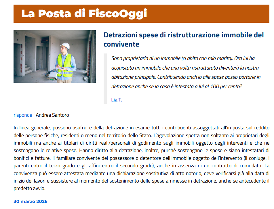 FiscoOggi – Detrazioni spese di ristrutturazione immobile del convivente