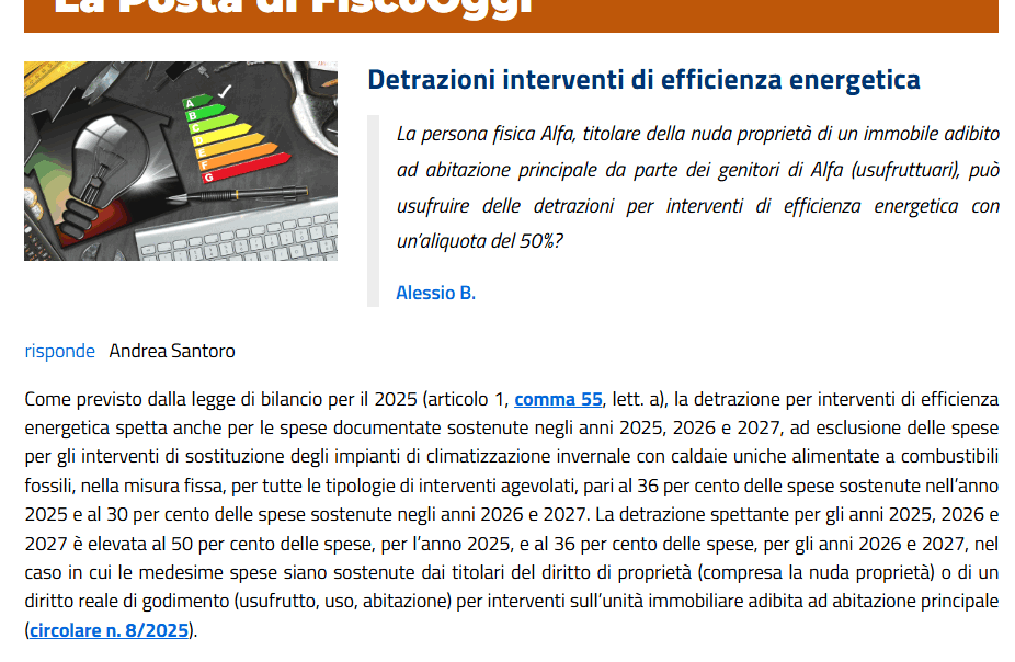 Nuovo chiarimento FiscoOggi Detrazioni interventi di efficienza energetica La persona fisica Alfa, titolare della nuda proprietà di un immobile adibito ad abitazione principale da parte dei genitori di Alfa (usufruttuari), può usufruire delle detrazioni per interventi di efficienza energetica con […]